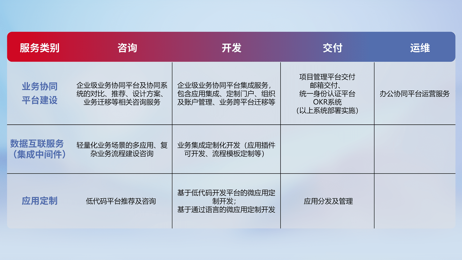 针对钉钉、、、企微、、、、IDaas等平台级产品提供产品的规划、、、方案、、、交付、、、定制化开发等服务,,,实现如统一协同办公、、智能客户服务、、、、混合会议管理、、智能数据查询、、等业务场景,,,,实现数字化转型。。。。